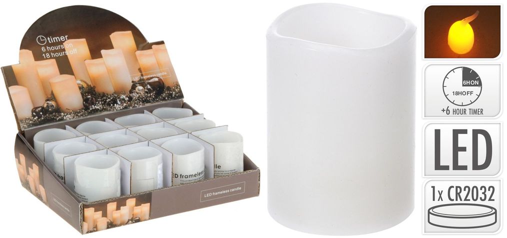 Blockljus med timer och naturtrogen låga som lyser upp med varmvitt sken.