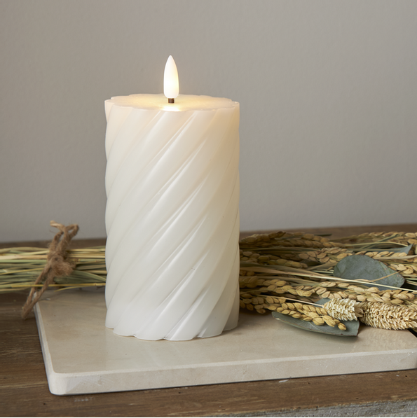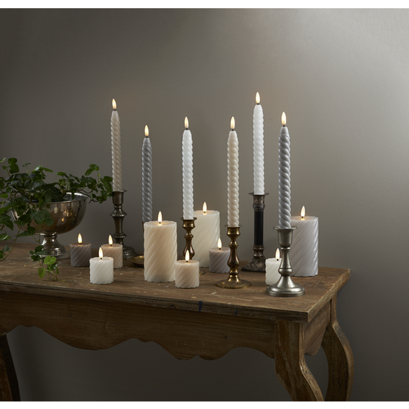 Vitt ljus med twist formad vax i vår Flamme serie.