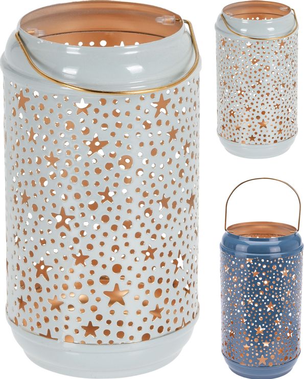 Ljuslykta i metall med handtag och mönster i form av stjärnor vilket ger ett fint sken.