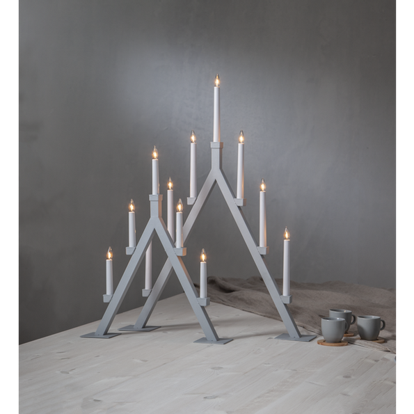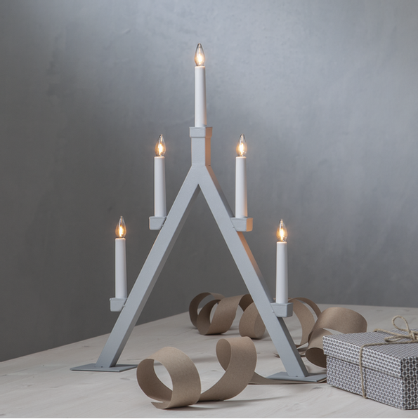 Oliver är en adventsljusstake i grå metall. 5 ljuskällor lyser stämningsfullt och skapar en fin julstämning i hemmet eller i den offentliga miljö.