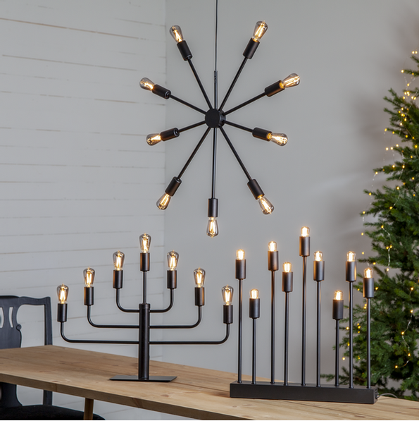 Ljusstaken har plats för 9 ljuskällor. E14 sockel.