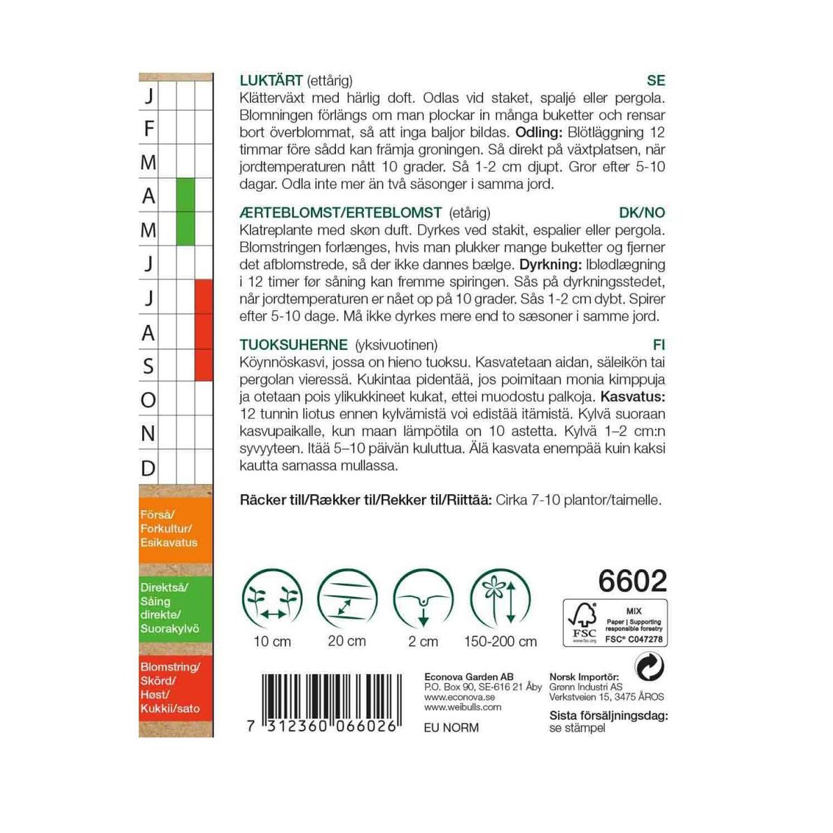 Klätterväxt med härlig doft. Odlas vid staket, spaljé eller pergola. Blomningen förlängs om man plockar in många buketter och rensar bort överblommat, så att inga baljor bildas.