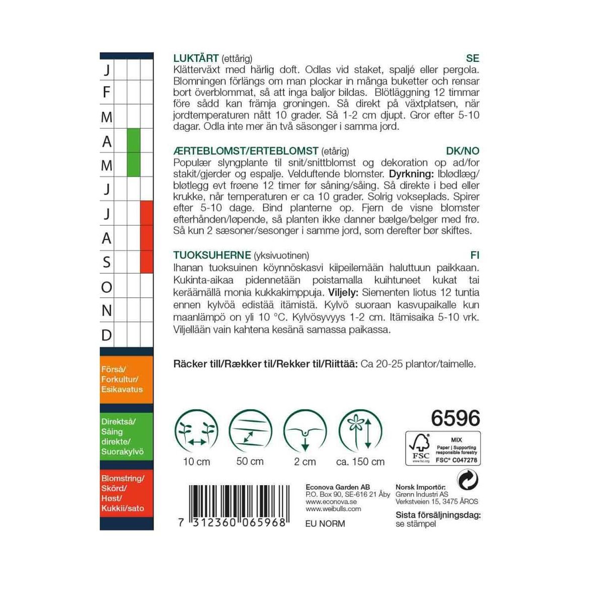 Klätterväxt med härlig doft. Odlas vid staket, spaljé eller pergola. Blomningen förlängs om man plockar in många buketter och rensar bort överblommat, så att inga baljor bildas. Blötläggning 12 timmar före sådd kan främja groningen. Även försiktig slipning av fröna med sandpapper.