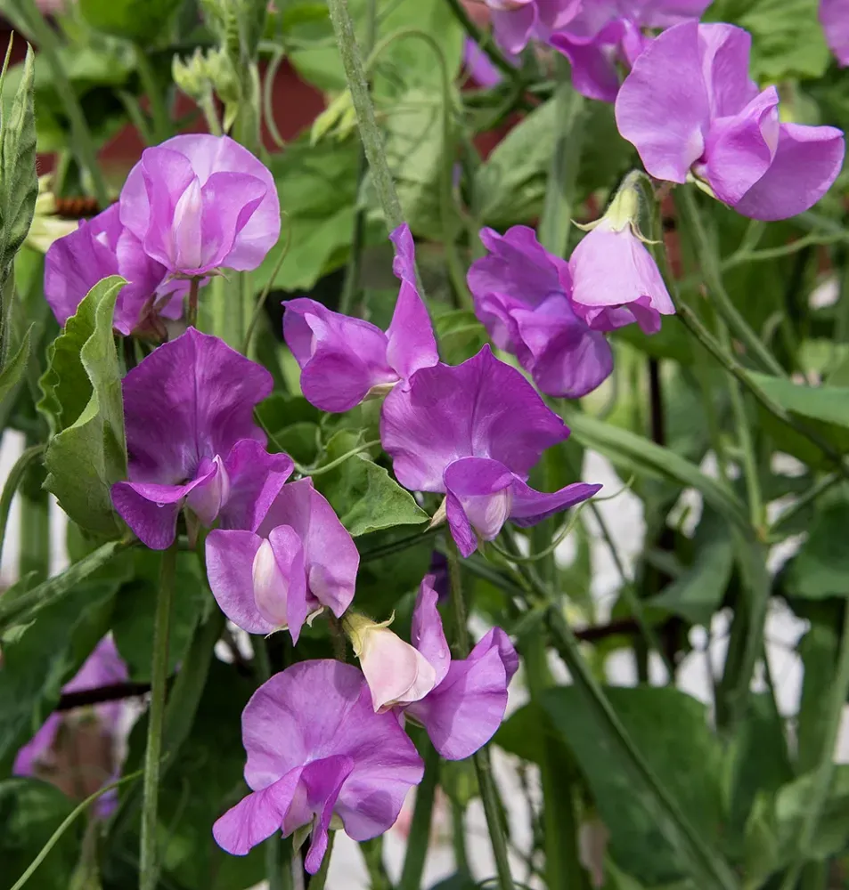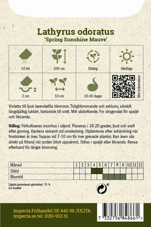 Violetta till ljust lavendellila blommor. Tidigblommande och exklusiv, särskilt långstjälkig luktärt, fantastisk till snitt. Milt väldoftande. Fin slingerväxt för spaljé och liknande.