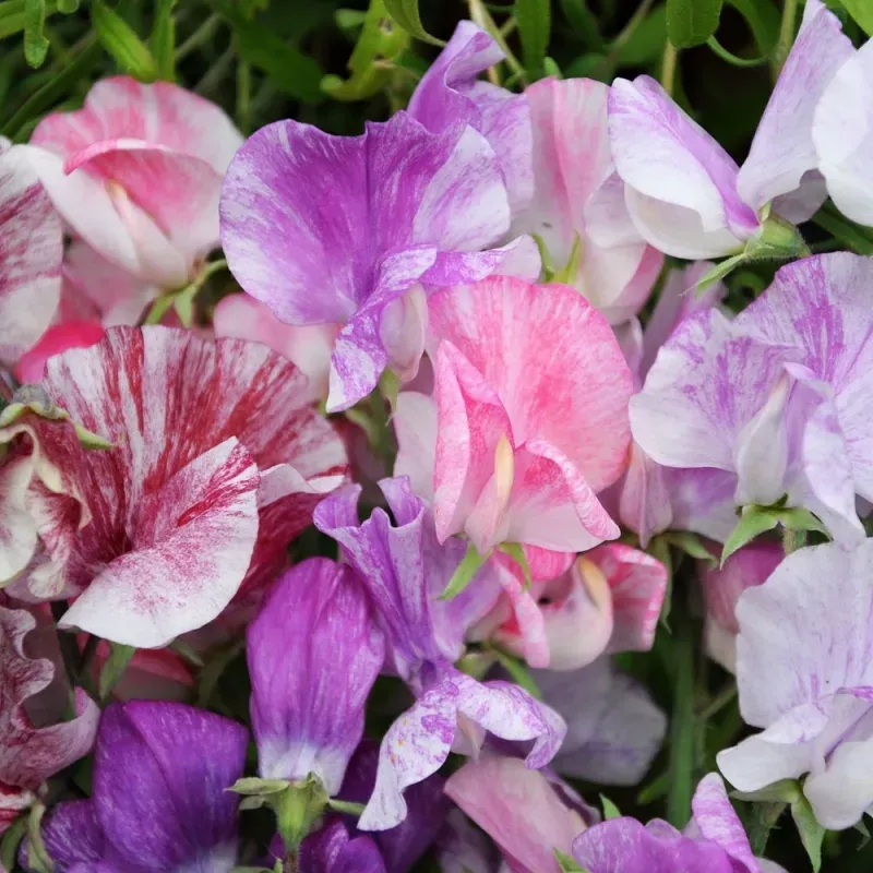 Vita blommor med strimmor i blått, choklad, lavendel, orange, rosa, purpur och rött. Kontrastrik och väldoftande.