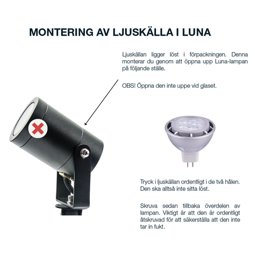 En allround markspot med lagom ljusspridning som passar små till medelstora träd och buskar. Luna är ett bra val om du vill belysa prydnadsgräs, hortensior och andra ljusgenomsläppliga växter. Ett tips är att sticka ner lampan rakt i centrum på växten – då skapas magi mellan skuggorna och ljuset. För att belysa mycket breda och lägre träd som du ser från flera håll, kan du med fördel använda två lampor.