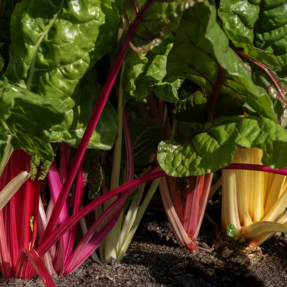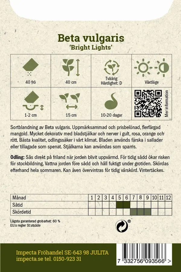Uppmärksammad och prisbelönad, flerfärgad mangold. Mycket dekorativ med bladstjälkar och nerver i gult, rosa, orange och rött. Bästa kvalitet, odlingssäker i vårt klimat. Bladen används färska i sallader eller tillagade som spenat. Stjälkarna kan användas som sparris.