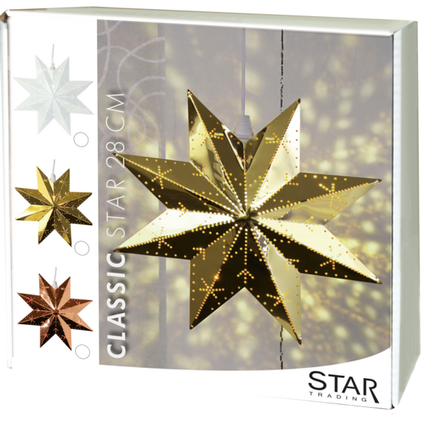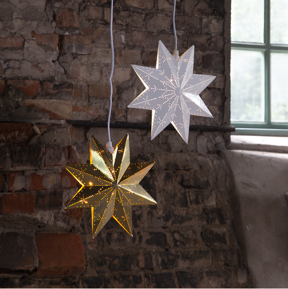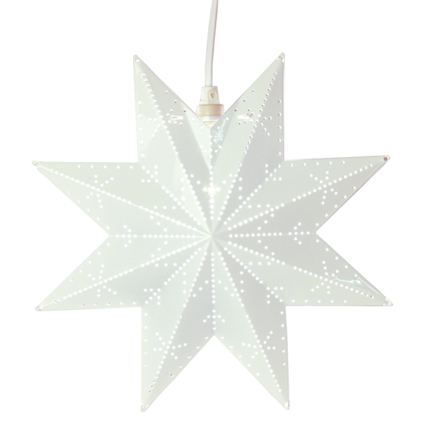 Vacker vit metallstjärna för inomhusbruk. Stjärnan har fina detaljer och plats för en ljuskälla.