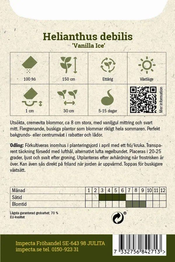 Utsökta, cremevita blommor, ca 8 cm stora, med vaniljgul mittring och svart mitt. Flergrenande, buskiga plantor som blommar rikligt hela sommaren. Perfekt bakgrunds- eller centrumväxt i rabatter och lådor.