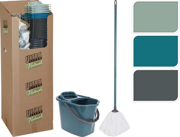 Komplett moppset med hink, skaft, mopphuvud och urvridare.