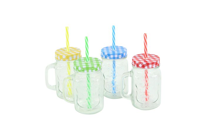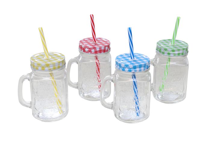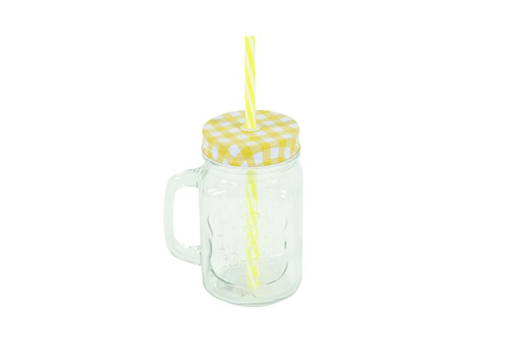 Trevlig mugg i glas med handtag, lock och sugrör.