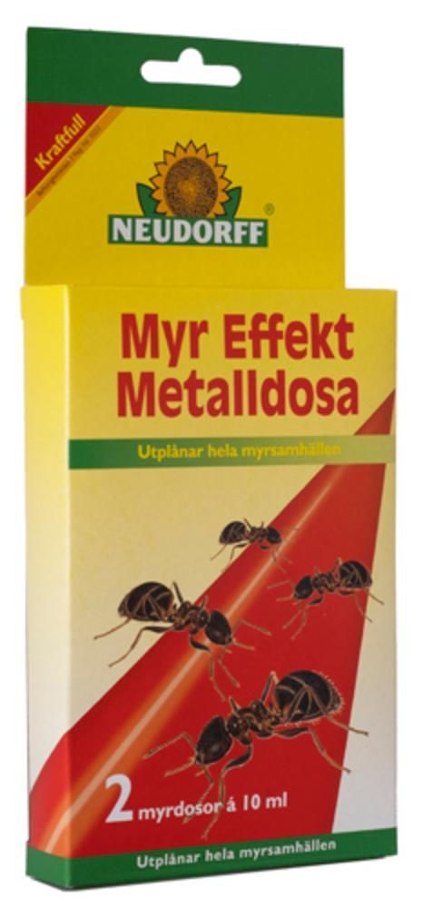 Myr Effekt metalldosor lockar till sig arbetsmyror och därmed bekämpas hela myrsamhällen effektivt. Används med fördel inomhus, på balkonger samt terrasser. Arbetsmyrorna dricker av betet och tar det med sig till boet där hela kolonin matas och utplånas. Tack vare en fördröjd effekt, kan varje myra gå flera gånger mellan dosan och myrsamhället. Innehåller 2 dosor