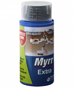 Extremt effektivt myrmedel mot myror på uteplatser och omkring byggnader. Myrr Extra utrotar myrboet snabbt och smidigt – Produkten fungerar genom att myrorna äter av sockerbetet och tar med sig det till boet, där yngel och drottning utfodras. Hela boet är därefter utrotat inom 7-14 dagar.