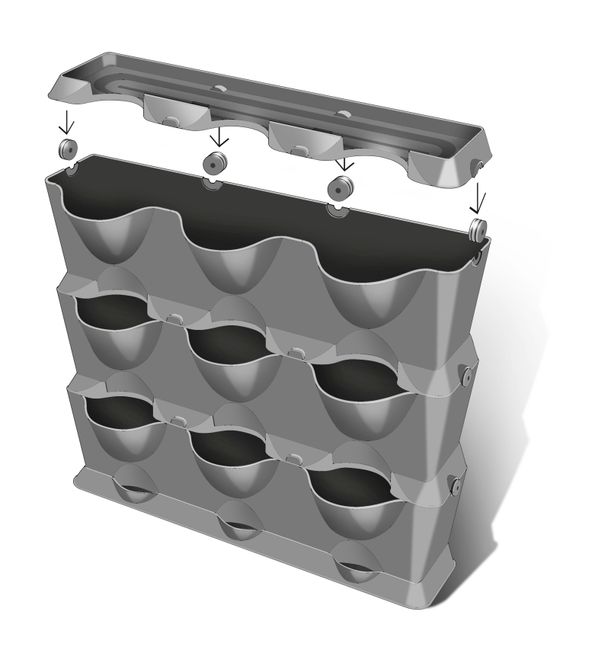 - Set med kopplingar: 3 vertikala krukor, 3 skydd, 1 basplatta, 12 klämmor