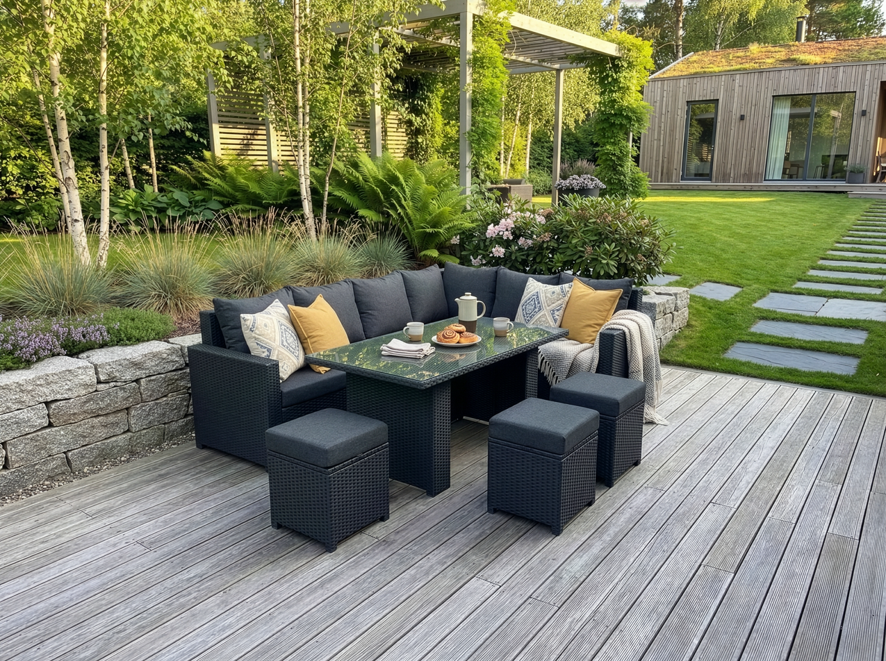 Soffgruppen är inte bara en fröjd för ögat, den är designad för optimal komfort och hållbarhet. De 10 cm tjocka sittdynorna och de mjuka ryggkuddarna är klädda i en tålig, mörk granitfärgad polyester och försedda med snygga keder-detaljer (kantsömmar) som ger både ett fantastiskt stöd och ett lyxigt intryck. Utöver den rymliga hörnsoffan och det rejäla matbordet med en toppskiva i härdat glas, ingår även tre praktiska pallar. Pallarna är utrustade med inbyggd förvaring, vilket är perfekt för att snabbt stuva undan småsaker eller plädar när de inte används.