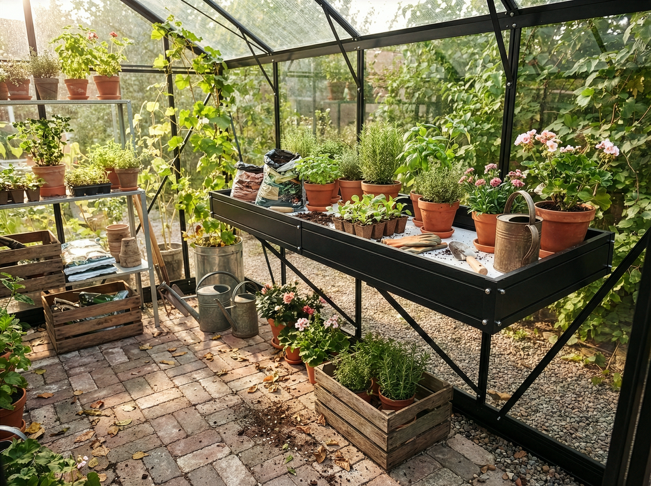 Växthushylla / odlingsbädd tillverkad av svartlackad aluminium inklusive skuv och beslag för att enkelt placera hyllan på valfritt ställe i växthuset. Perfekt odlingshylla att förkultivera din småplantor.