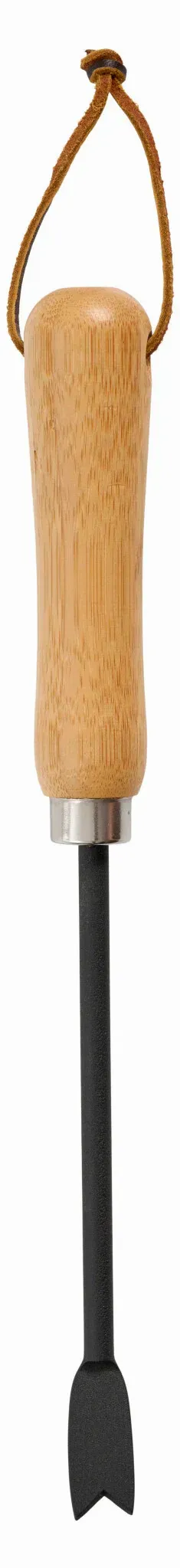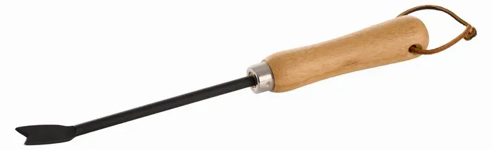 Ogräsborttagningsmedel som går ner i marken för att kloakera rötterna lågt och döda växten. Kroken är pulverlackerad metall och greppet är lackad bambu.