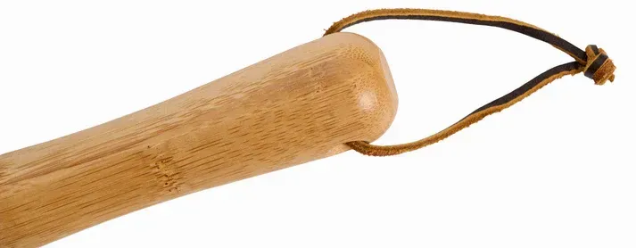 Levereras med ett brunt läderband för upphängning.