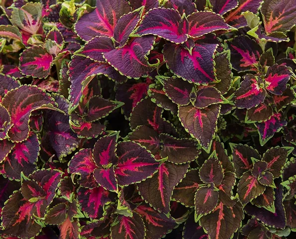 Stora, fintandade blad i mörkt rostrött till djupt purpur med ceriserosa till orange teckning och en välmarkerad, ljusgrön kantbård. Kompakt, fint växtsätt. Utmärkt samplanteringsväxt i krukor och rabatter. Kan även krukodlas inomhus året runt.