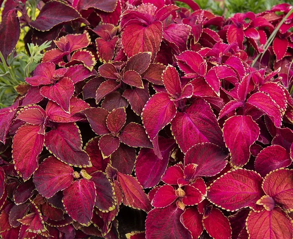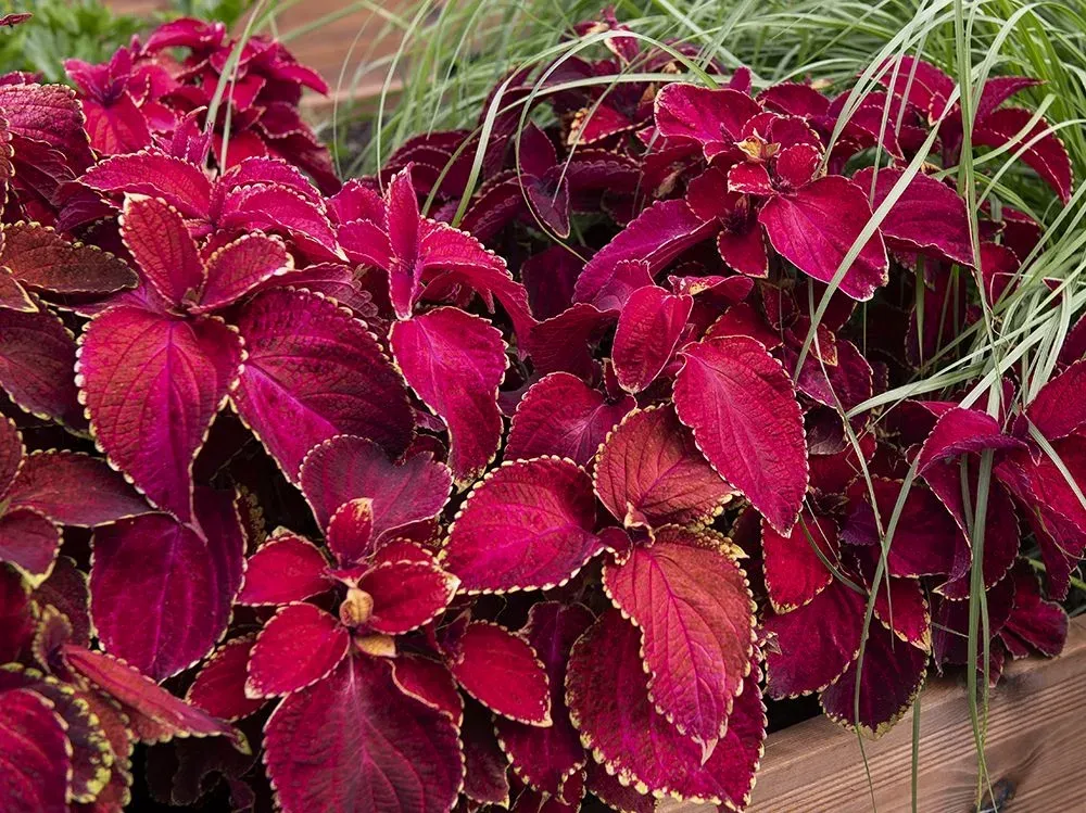 Stora, fintandade, varmt korallröda blad med mörk schattering och en fin, gyllengul kantbård. Kompakt, fint växtsätt. Utmärkt samplanteringsväxt i krukor och rabatter. Kan även krukodlas inomhus året runt.