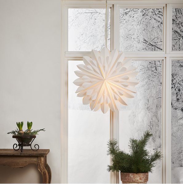 Stilfull och enkel vit pappersstjärna. Stjärnan sprider stämning och ger hemmet den där speciella julkänslan. Kan hängas både i fönster och mot en vägg.