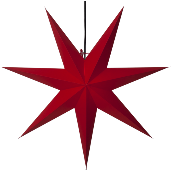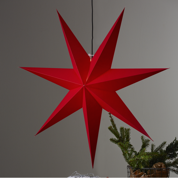 Röd pappersstjärna med svart textilkabel. Elegant stjärna att dekorera med i fönstret.