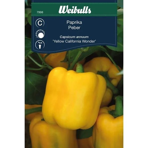 Paprika med en mild och söt smak. Perfekta i allt från sallader till grillrätter. En favorit i köket. Ca 8-10 cm stora frukter. Odling: Så inomhus i såjord i feb-mars. Så grunt. Gror efter 8-20 dagar vid 22-25 grader. Plantera om i småkrukor med plantjord. Plantera ut i växthuset när temperaturen kan hållas över 12 grader hela dygnet. Bind upp plantorna efter hand. Frukterna blir först gröna och övergår till gult. De kan skördas i alla stadier. Mer information Höjd: 60-80 cm Växtavstånd: 40 cm Planteringsdjup: 0,5 cm Räcker till: Ca. 20 plantor