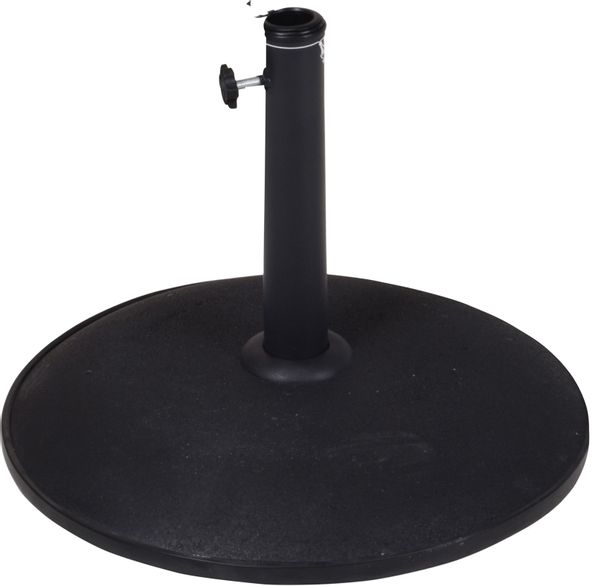 Parasollfot i svart betong med gummiring runt betongen. Stolprör i svart pulverlackerat stål.