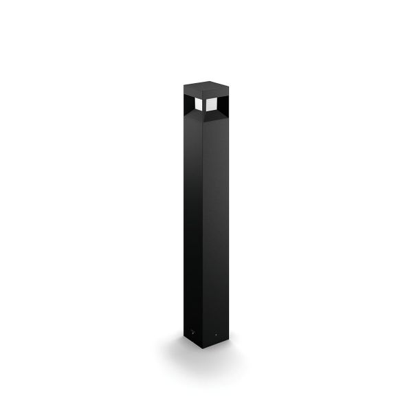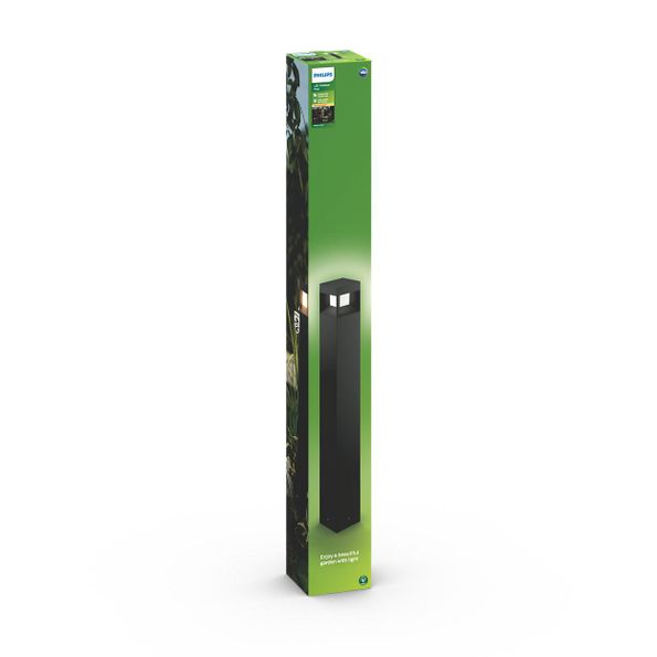 Philips Parterre LED-utomhus svarta stolplampa en kubformad hållare i slitstark pressgjuten aluminium. Den sinnrika designen är iögonfallande och kastar strålar av varmvitt ljus i alla riktningar.