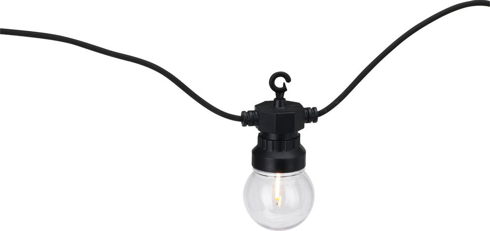 Härlig partyslinga i svart för inom- och utomhusbruk med 20 stycken G50 varmvita filament LED-lampor. Lika vacker året om i din trädgård.