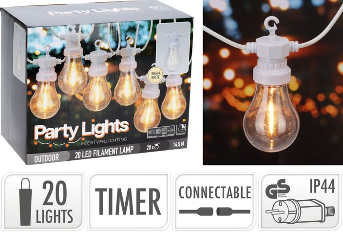 Härlig partyslinga i vitt för inom- och utomhusbruk med 20 stycken A60 varmvita filament LED-lampor. Lika vacker året om i din trädgård.
