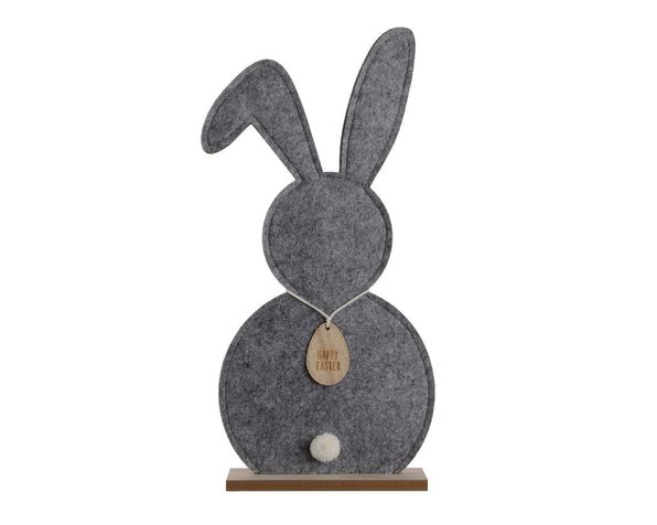 Påskhare i filt som står på en träplatta av mdf.