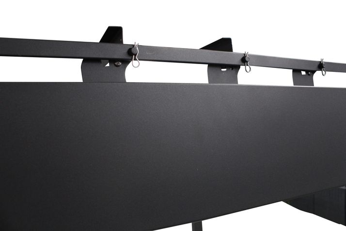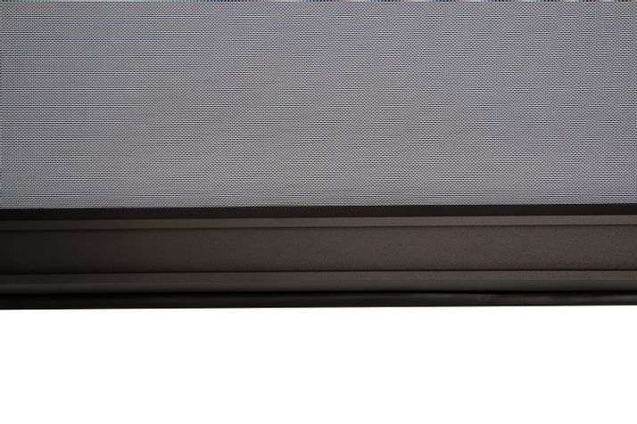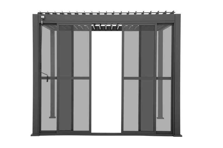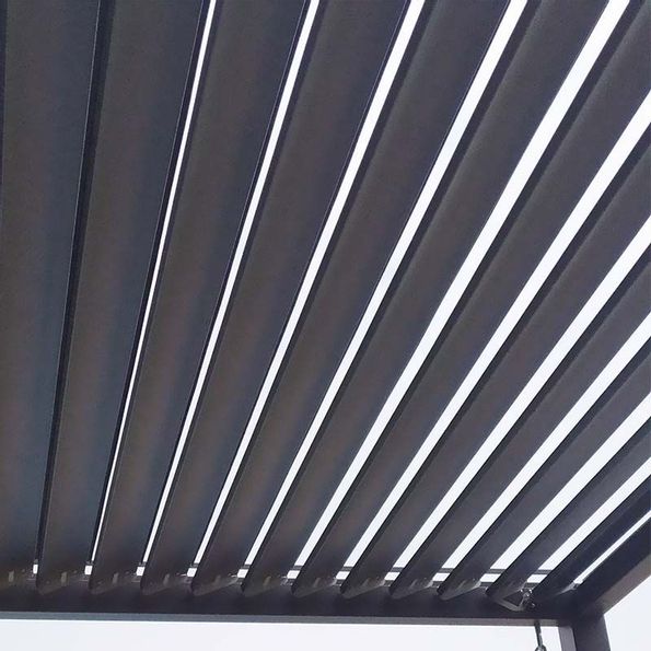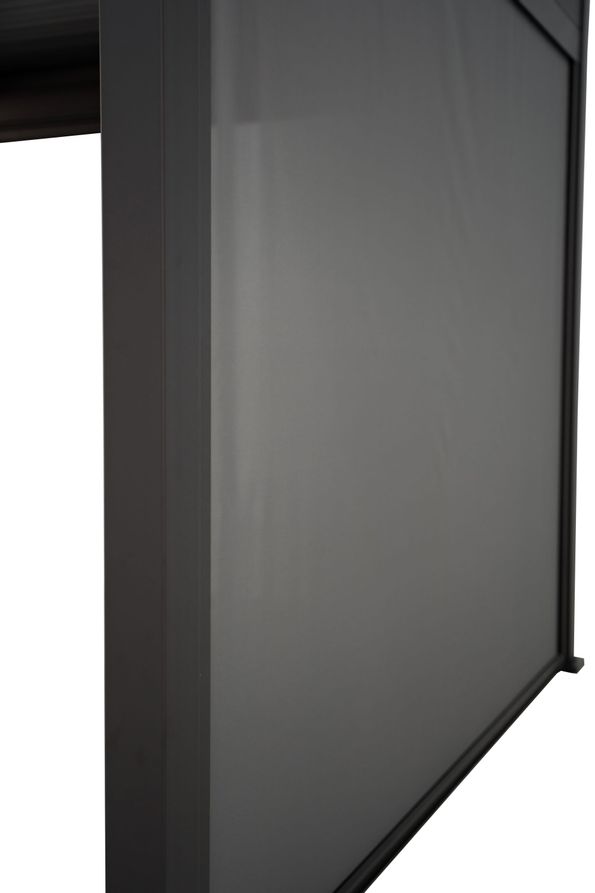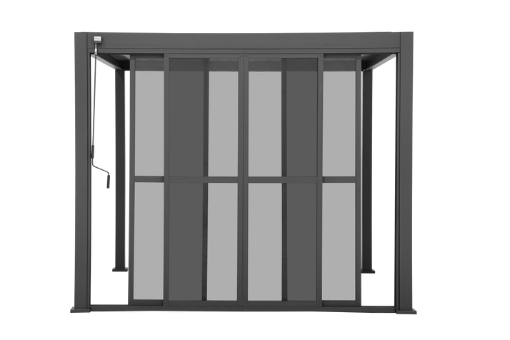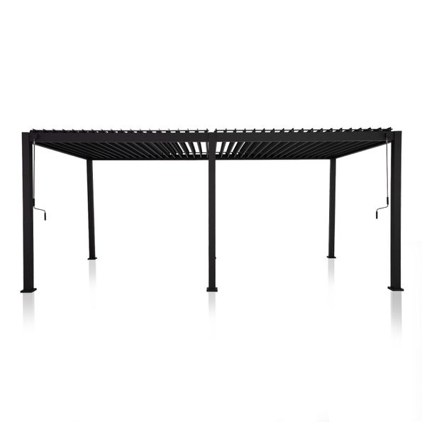 Pergolan finns i antracitgrå pulverlackerad färg. Stommen är tillverkad av kraftig aluminium och lamellerna av galvaniserad stål. Lamelltaket öppnas och stängs med en hjälp av en manuell handvev.