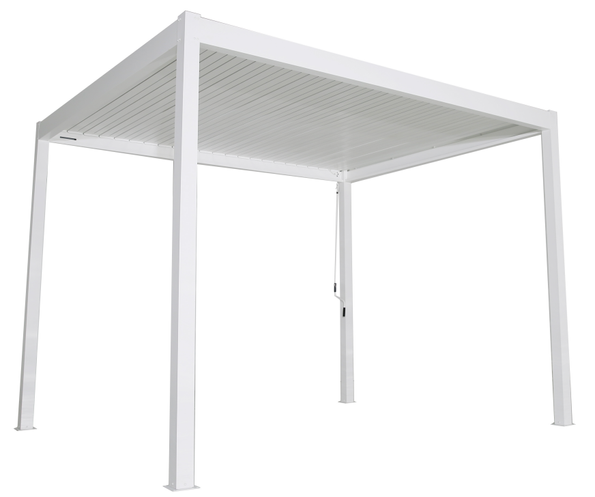 Pergolan finns vitt eller antracitgrå pulverlackerad färg. Stommen är tillverkad av kraftig aluminium och lamellerna av galvaniserad stål. Lamelltaket öppnas och stängs med en hjälp av en manuell handvev.
