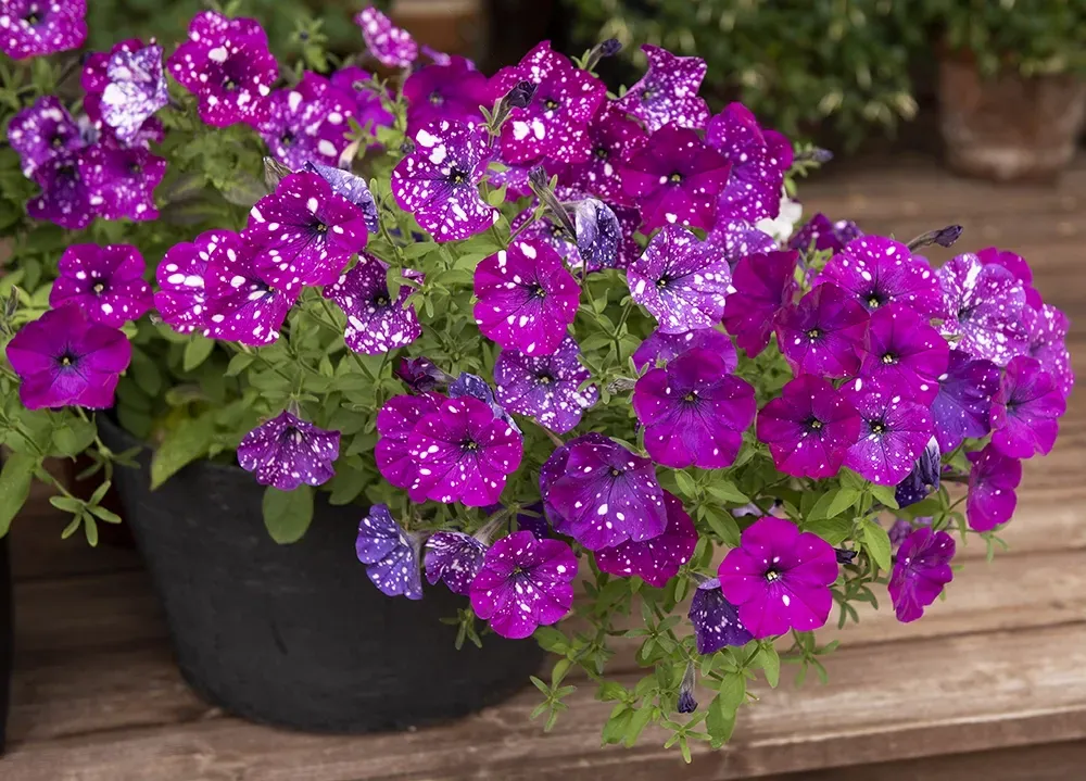 Generöst med blommor i skiftande lila till mörkt cerise, varje blomma med en unik teckning av vita prickar och fläckar, som framträder olika mycket beroende på temperatur och läge. Stadiga och vädertåliga plantor för krukor, låda och rabatt.