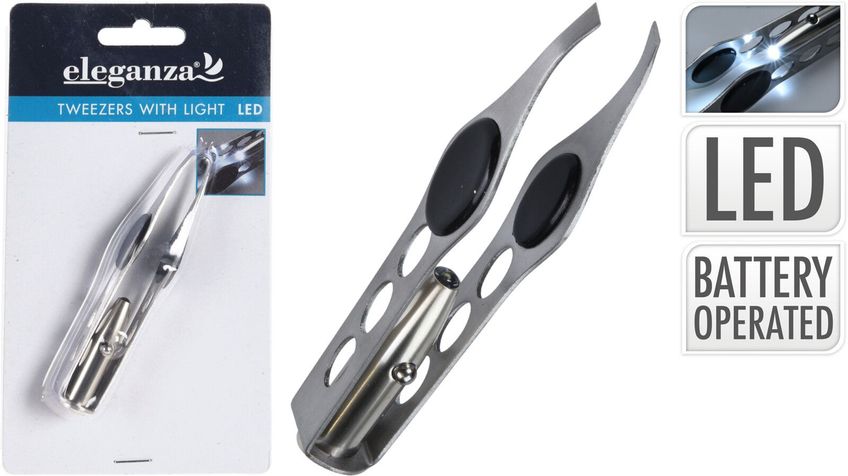 Pincett i metall med LED ljus. Batteri medföljer.