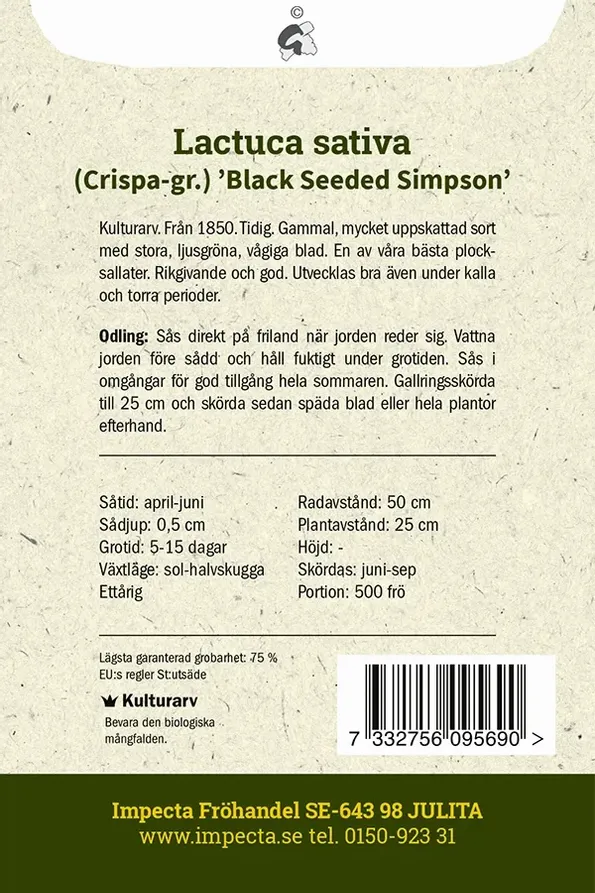 Kulturarv. Från 1850. Tidig. Gammal, mycket uppskattad sort med stora, ljusgröna, vågiga blad. En av våra bästa plocksallater. Rikgivande och god. Utvecklas bra även under kalla och torra perioder.