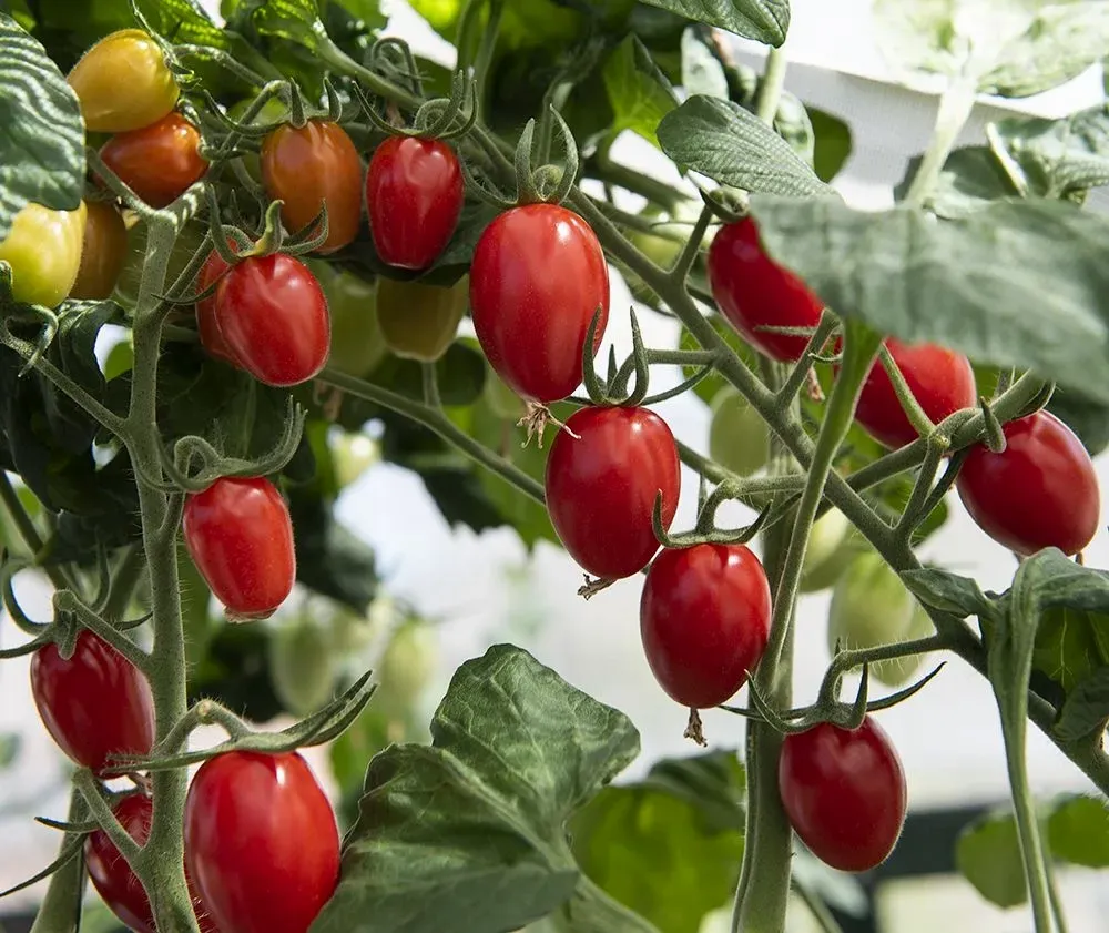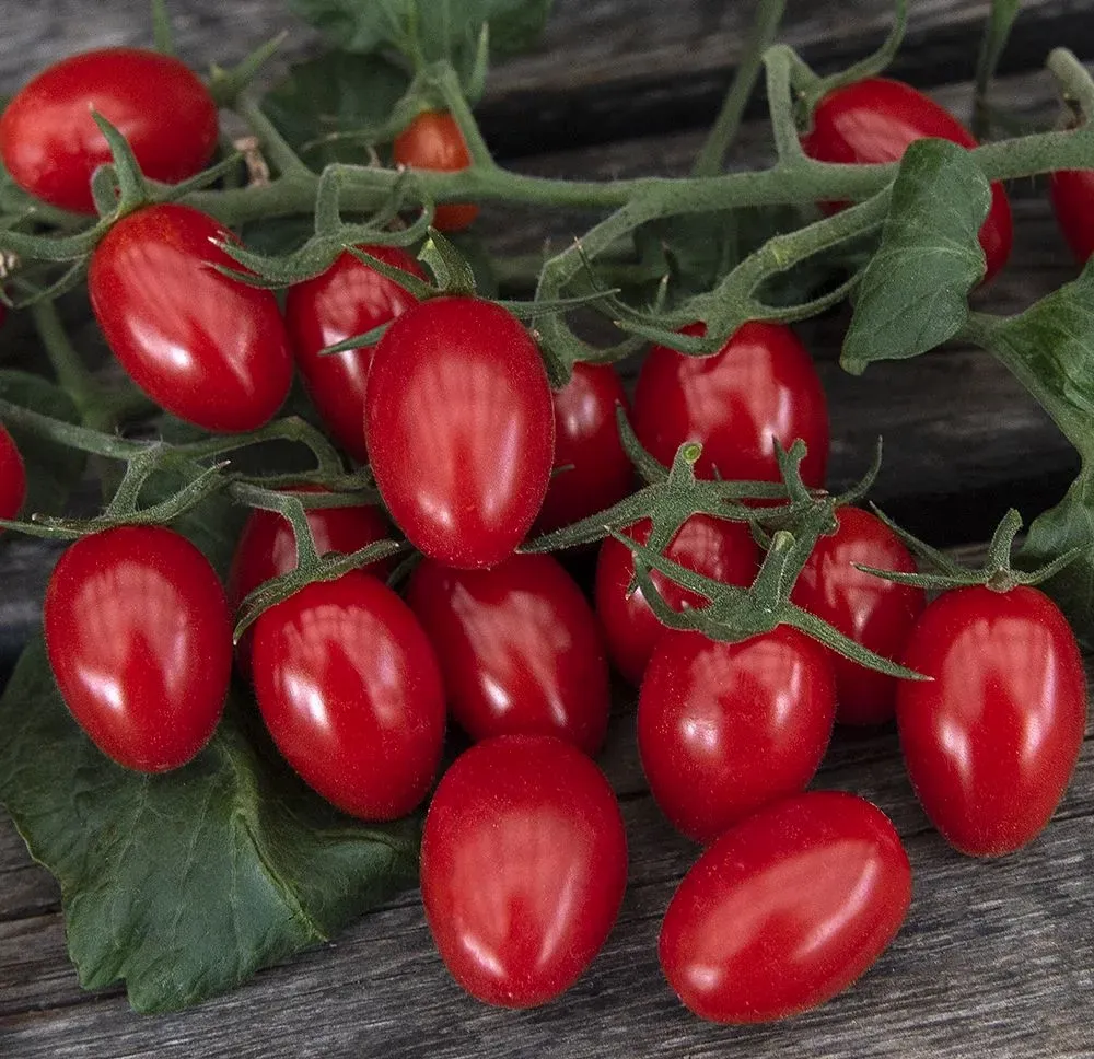 Miniplommontomat. Glänsande röda, 4-5 cm stora frukter på ca 25 gram i långa klasar. Lite fastare fruktkött, mycket smakrik med superb sötma och syra, utsökt i sallad och på grillen.