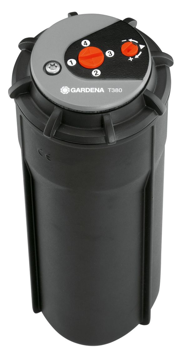GARDENA Turbodriven popupspridare T 380 – som ingår i GARDENA Sprinklersystem – är perfekt anpassad för bevattning av mellanstora gräsmattor upp till 380 m². Om nödvändigt kan den popupspridaren T 380 kombineras med de turbodrivna popupspridarna T 100 och 200 (artikelnr 8201-29 eller 8203-29) och den oscillerande popupspridaren R 140 (artikelnr 1537-29). Räckvidden kan justeras variabelt mellan 6 och 11 m för det enskilda området. Området som ska bevattnas kan justeras steglöst – utan verktyg – på spridarhuvudet mellan 25° till 360°. Allt från små områden till fullständiga cirklar kan bevattnas. Med minnesfunktionen återgår spridaren automatiskt till det förinställda området, även om spridarens huvud avsiktligt vrids. Detta säkerställer att rätt område alltid bevattnas.