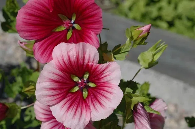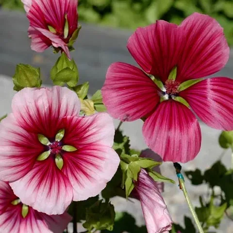 Traditionell sommarblomma. Stora, sidenglänsande malvablommor i cerise, rosa och vitt. Fin till rabatter och buketter.