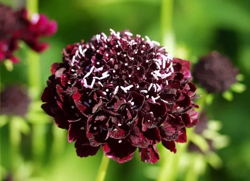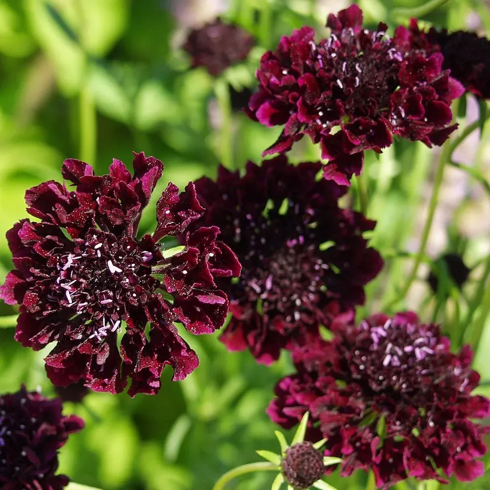 Stora, tätt dubbla, mörkt purpurfärgade, doftande blommor med vit ståndarbukett. Utmärkt för snitt och rabatt. Kan även torkas.