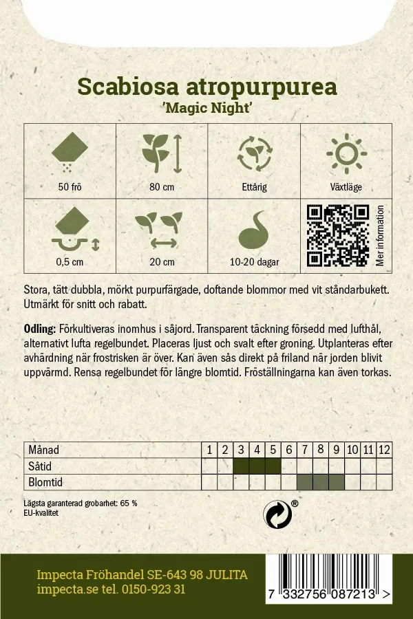 Förkultiveras inomhus i såjord. Transparent täckning försedd med lufthål, alternativt lufta regelbundet. Placeras ljust och svalt efter groning. Utplanteras efter avhärdning när frostrisken är över. Kan även sås direkt på friland när jorden blivit uppvärmd. Rensa regelbundet för längre blomtid. Fröställningarna kan även torkas.