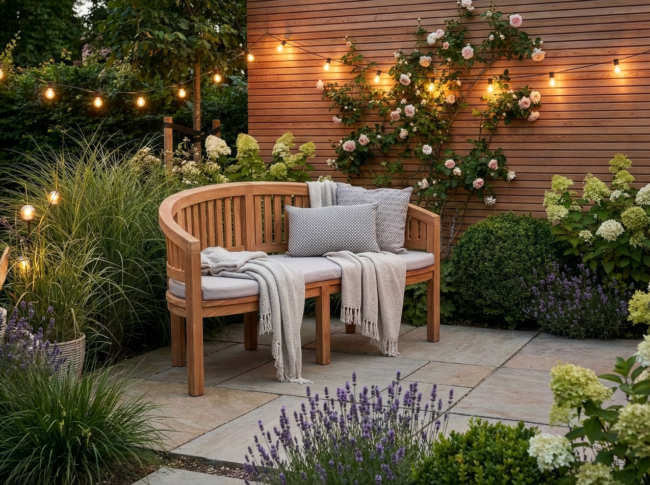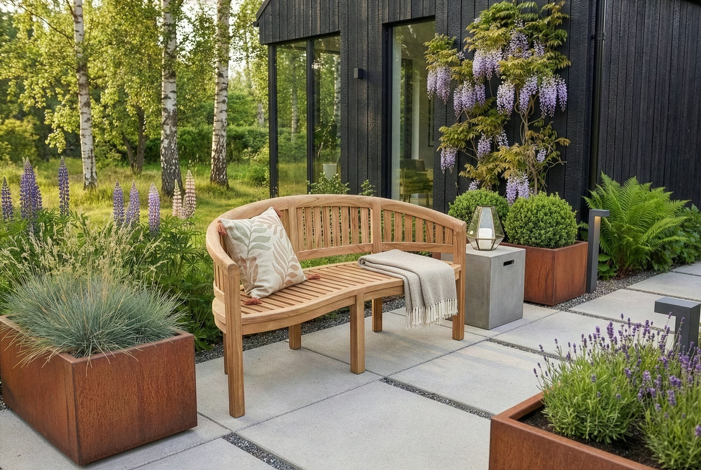 Prärieklocka Teakbänk. Teak är det primära valet av trä för tillverkning av utemöbler. Tack vare fiberns täthet samt träets höga oljehalt är teaken mycket väderbeständig och kan stå ute året runt. Nya teakmöbler har en brun färg som i sitt naturliga åldrande kommer att övergå till en silvergrå patina. Teaken i våra möbler kommer från Indonesien, Tectona Grandis, och är den mest kvalitativa.