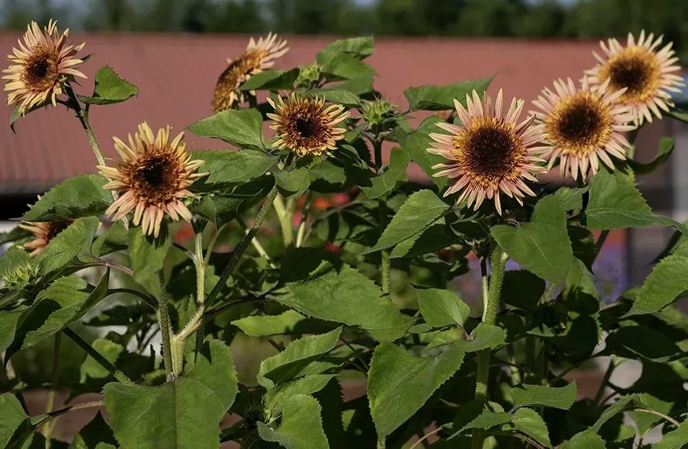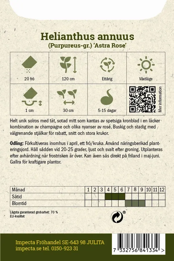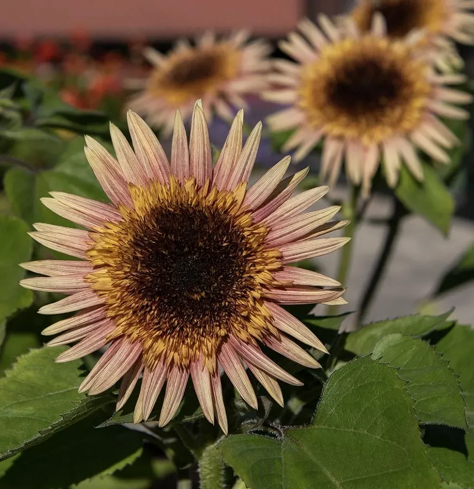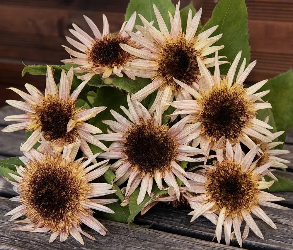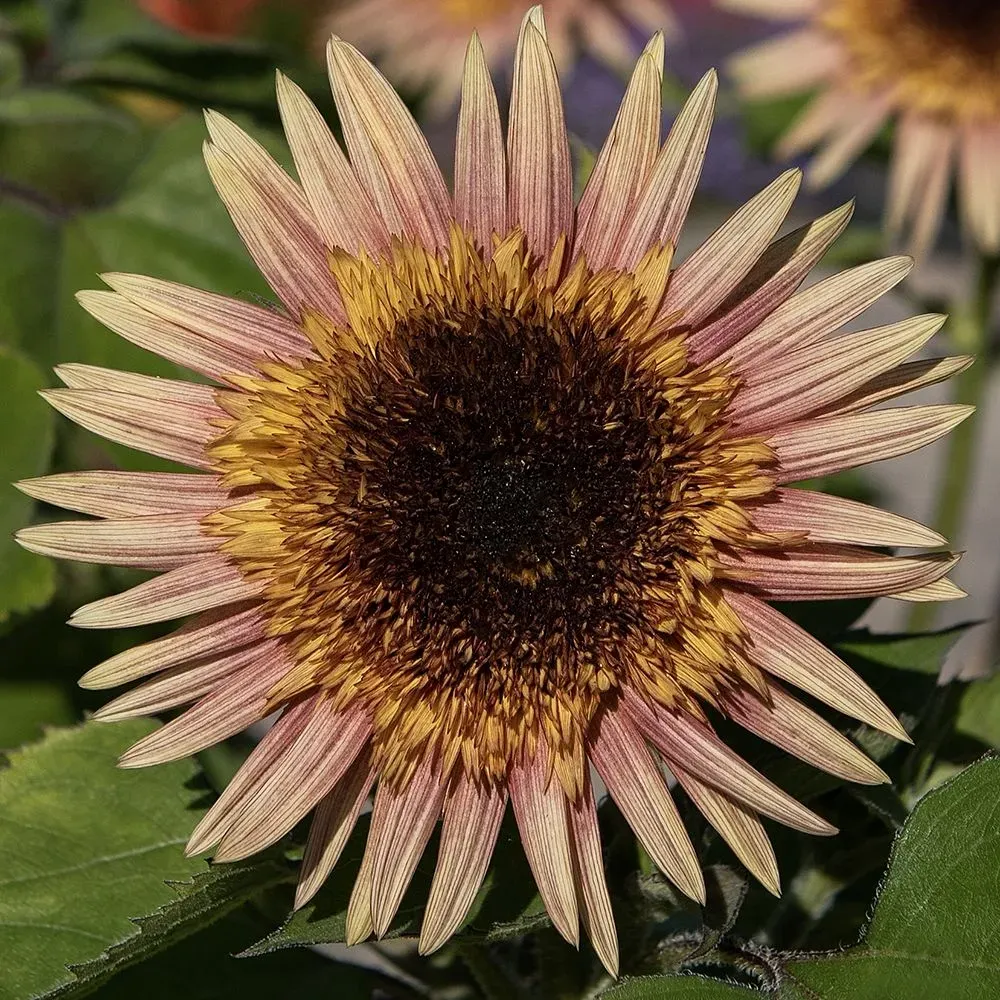 Helt unik solros med tät, sotad mitt som kantas av spetsiga kronblad i en läcker kombination av champagne och olika nyanser av rosé. Buskig och stadig med välgrenande stjälkar för rabatt, snitt och stora krukor.