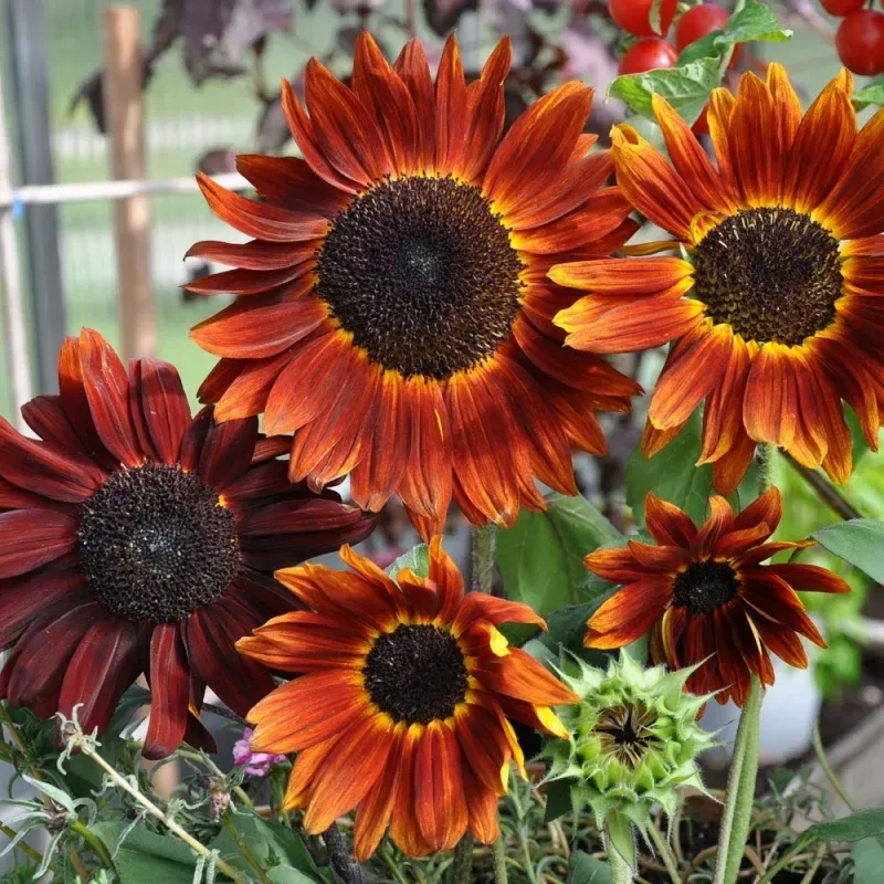 Ståtlig solros i fin färgvariation från rostrött med gyllengul kant till djupt vinrött, alla med mörk mitt. Effektfull bakgrunds- och centrumväxt för snitt och rabatt.
