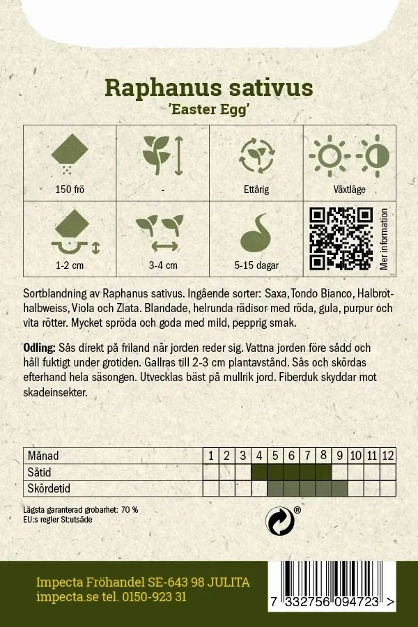 Sås direkt på friland när jorden reder sig. Vattna jorden före sådd och håll fuktigt under grotiden. Gallras till 2-3 cm plantavstånd. Sås och skördas efterhand hela säsongen. Utvecklas bäst på mullrik jord. Fiberduk skyddar mot skadeinsekter.
