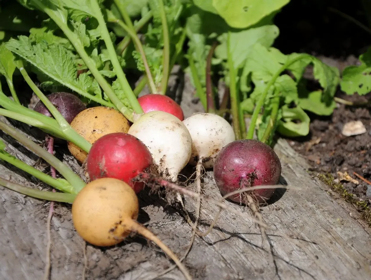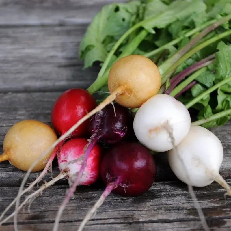 Blandade, helrunda rädisor med röda, gula, purpur och vita rötter. Mycket spröda och goda med mild, pepprig smak.