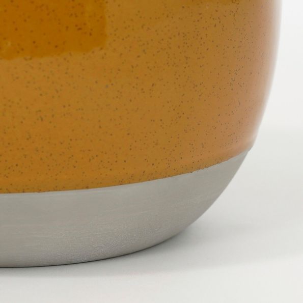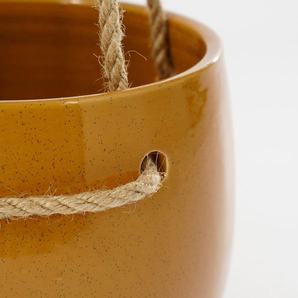Gul ampel i keramik med en grå botten och upphängning i jute.