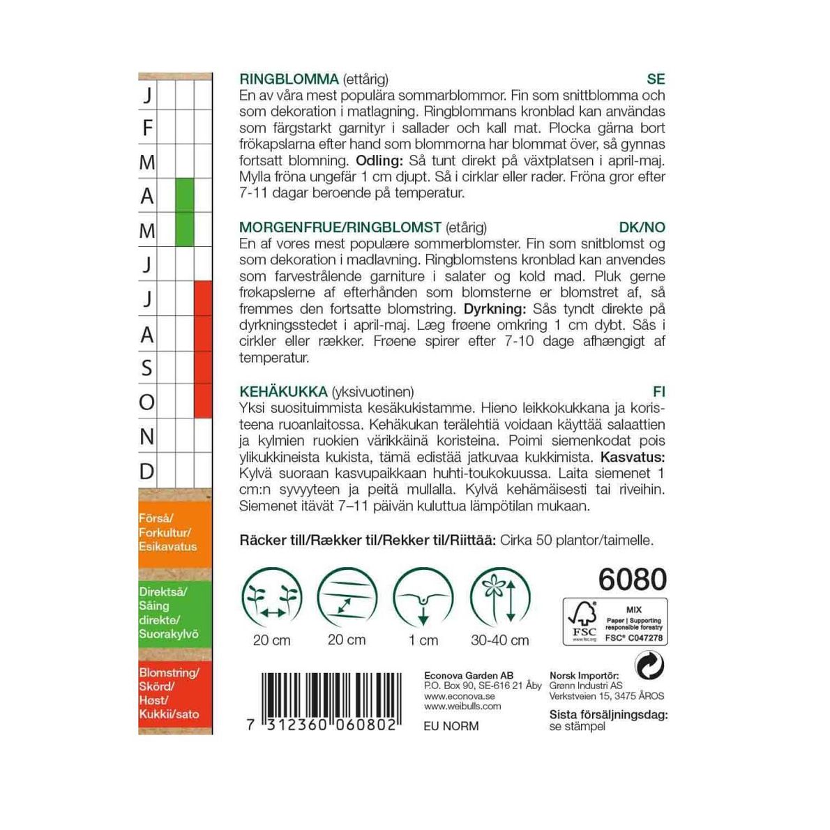 En av våra mest populära sommarblommor. Fin som snittblomma och som dekoration i matlagning. Ringblommans kronblad kan användas som färgstarkt garnityr i sallader och kall mat. Plocka gärna bort frökapslarna efter hand som blommorna har blommat över, så gynnas fortsatt blomning.