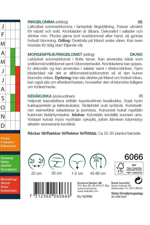 Lättodlad sommarblomma i fantastisk färgställning. Passar utmärkt för rabatt och snitt. Kronbladen är ätbara. Dekorativt i sallader och drinkar mm. Plocka gärna bort överblommat efter hand, så gynnas fortsatt blomning långt in på hösten. Direktsås på friland under våren. Kan även höstsås för tidig start följande vår.